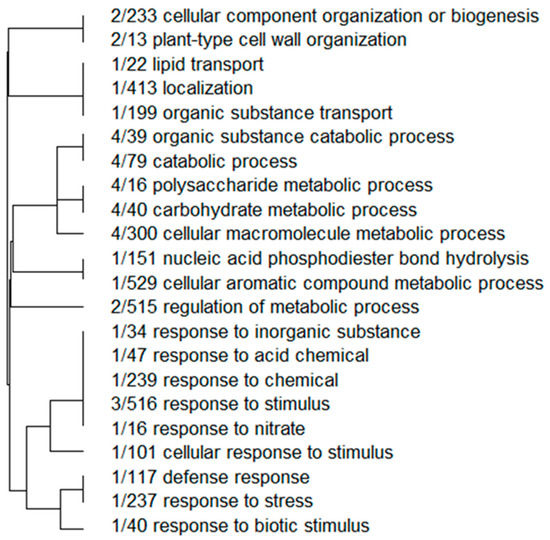 Strikingly, the hop transcriptome contained 661 target mRNAs, and among them, 370 represented unique target sites of one of the nine validated V. nonalfalfae milRNAs, and the remaining 291 transcripts contained target sites for two or more milRNAs. The majority of the target transcripts were predicted to be targets of a single milRNA (conserved-miR-7044). The GO functional annotation, falling under the term biological processes, indicated that most of the predicted target transcripts belonged to plant defense responses, biotic and abiotic stress responses (Figure 4), metabolic process regulation, carbohydrate and polysaccharide metabolism and cell wall organization.