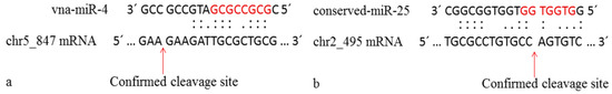 Schematic representation of the experimentally validated cleavage sites of the target mRNAs; (a)—evm.model.chr5_1271NY.847 and (b)—evm.model.chr2_1770NN.495; the seed region of mature milRNA is highlighted in red.