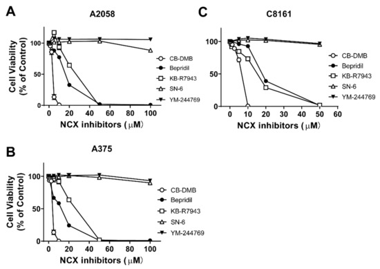 Effect of NCX inhibitors on viability of melanoma cells. (A–C) Viability of BRAF mutated human melanoma cell lines (A2058, A375, and C8161) after exposed to NCX blockers bepridil, KB-R7943, CB-DMB, SN-6, or YM-244769 at 0–100 µM for 48 h. n = 4–5 independent tests per group.