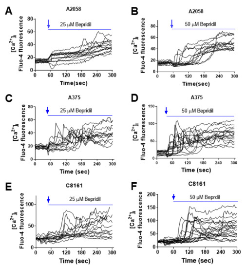 Effect of the NCX blocker bepridil on the level of cytosolic Ca2+ ([Ca2+]i) measured by Ca2+ imaging assay. (A,B) Flua-4 AM loaded A2058 melanoma cells were imaged and perfused with bepridil (25 or 50 µM) in the solution containing 2 mM Ca2+. (C,D) A375 melanoma cells were loaded with Flua-4 AM, imaged and perfused with bepridil (25 or 50 µM). (E,F) Ca2+ imaging traces of C8161 melanoma cells. The recording traces were representatives of 3 separate experiments, and n = 15–20 cells were imaged per experiment.