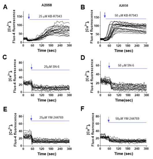 Effect of KB-R7943, SN-6 and YM-244769 on the level of cytosolic Ca2+ ([Ca2+]i) in A2058 melanoma cells. (A,B) Flua-4 AM loaded A2058 melanoma cells were perfused with KB-R7943 (25 or 50 µM) in the solution containing 2 mM Ca2+. KB-R7943 elevated cytosolic Ca2+ level. (C,D) A2058 cells were loaded with Flua-4 AM, imaged and perfused with SN-6 (25 or 50 µM). (E,F) Ca2+ imaging traces of A2058 cells that were perfused with YM-244769 (25 or 50 µM). The recording traces were representatives of 3 separate experiments; n = 14–18 cells were imaged per experiment.