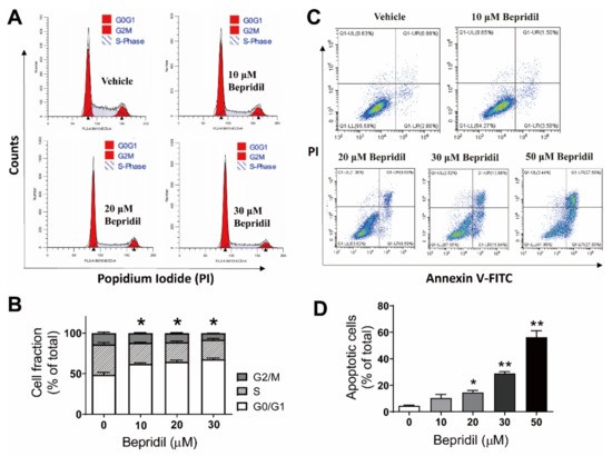 Bepridil-induced cell cycle arrest and apoptosis in melanoma cells. (A,B) Cell cycle profile of A2058 cells incubated with vehicle or bepridil (10, 20, and 30 μM) for 18 h. The vehicle was cell culture medium containing DMSO (1/1000, v/v). Bepridil increased the proportion of cells in G0/G1 phase. * p < 0.05, G0/G1 phase of bepridil treated groups vs. vehicle treatment, n = 5 experiments. (C,D) A2058 cells were treated with bepridil (10, 20, 30, 50 μM) for 24 h and then analyzed with Annexin V-FITC/PI apoptosis assay. Bepridil increased the fraction of apoptotic cells (Annexin V+). * p < 0.05 and ** p < 0.01, compared with vehicle treatment; one-way ANOVA followed by a Tukey’s post-hoc test, n = 5.