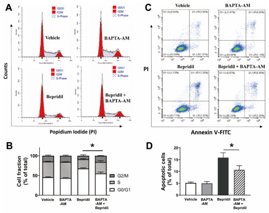 The Ca2+ chelator BAPTA-AM prevented bepridil to induce cell cycle arrest and apoptosis. (A,B) Cell cycle profile of A2058 cells incubated with vehicle, BAPTA-AM (10 μM), bepridil (25 μM), and BAPTA-AM + bepridil for 18 h. BAPTA-AM alone did not incur cell fraction changes but significantly attenuated bepridil-induced cell cycle arrest. * p < 0.05, G0/G1 phase of bepridil vs. BAPTA-AM + bepridil, n = 5 independent experiments. (C,D) A2058 cells treated with vehicle, BAPTA-AM (10 μM), bepridil (25 μM), and BAPTA-AM + bepridil for 24 h. * p < 0.05, apoptotic cell fraction in bepridil treatment vs. BAPTA-AM + bepridil; one-way ANOVA followed by a Tukey’s post hoc test, n = 5.
