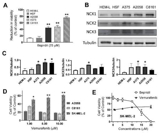 The impact of bepridil on melanocytes and NRAS mutated melanoma cell. (A) Human melanoma cells, epidermal melanocytes-light (HEM-L) cells, and skin fibroblasts (HSF) were treated with bepridil (25 μM) for 24 h. Reduction in cell viability was expressed as the percent reduction with respect to control cells. ** p < 0.01, each cell line compared with HEM-L, n = 3. (B) The three NCX isoforms detected in these cell lines. (C) Quantifications of the three NCX isoforms obtained by western blotting. * p < 0.05, each cell line compared with HEM-L, n = 3. (D) Effects of the BRAF inhibitor vemurafenib on viability of A2058, C8161 and SK-MEL-2 cells, 72 h. * p < 0.05, ** p < 0.01, SK-ME-2 compared with C8161 or A2058 cell line; one-way ANOVA followed by a Tukey’s post-hoc test, n = 5. (E) The dose–response relation between pharmacological agents and viability of SK-MEL-2 cells.