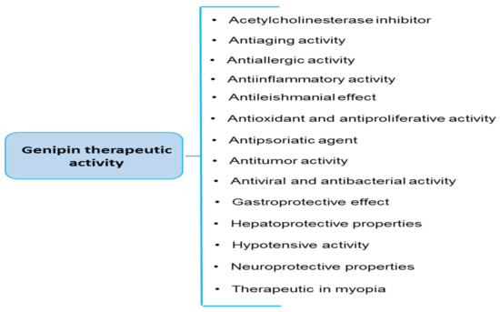In addition, all the data reported in this review paper, on both cellular and animal models, are based on extremely high doses of genipin administered, which prompt for pharmacological application of the molecular excluding the use as a natural supplement. Therefore, a particularly important goal would be to determine appropriate therapeutic doses of genipin. Moreover, from a pharmacological point of view, future experiments should explain the broad spectrum of biological activity of genipin. They may also exclude genipin with the category of Pan-assay interference compounds (PAINS) that often give false positive results in high-throughput screens [66].