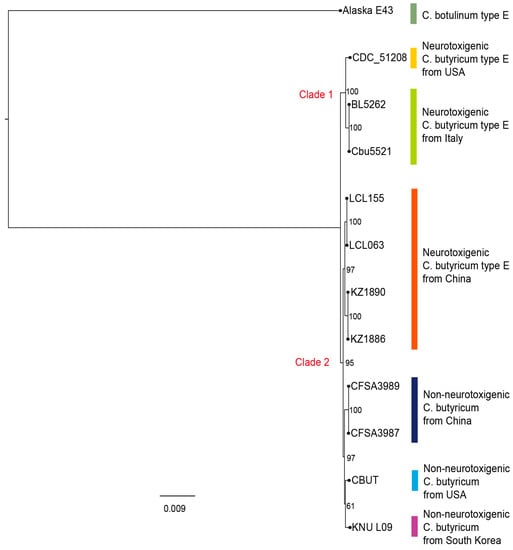 All C. butyricum strains clustered together and were grouped into two major clades (Figure 1), one of which (clade 1) included the genomes of the neurotoxigenic C. butyricum type E strains from Italy and the United States while the other (clade 2) consisted of the genomes of the four C. butyricum type E strains from China determined in this study and the non-neurotoxigenic C. butyricum strains. The analysis also confirmed that the clinical and food strains (LCL 063 and LCL 155) were closely related but not identical to the soil strains (KZ 1886 and KZ 1890) [,]. As expected, the C. botulinum type E strain Alaska E43 clustered distantly (Figure 1).