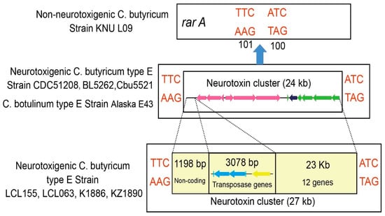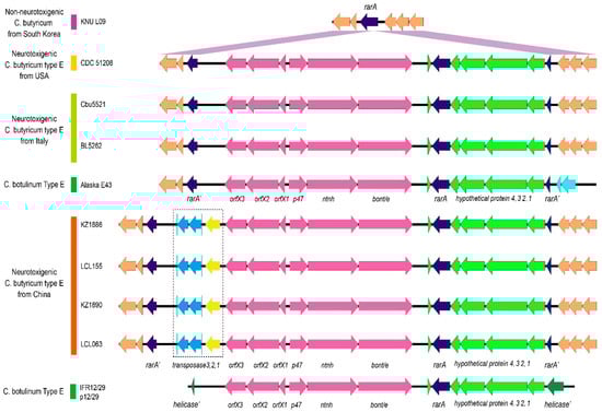 The neurotoxin gene clusters of BoNT/E-producing C. botulinum and C. butyricum strains have been reported to be part of a large gene cassette of ~24 kb that includes six additional conserved genes downstream of the bont/e gene, of which one is an intact rarA gene and the remaining ones are hypothetical genes; this 24 kb gene cassette may be inserted into either a chromosomal rarA gene or a plasmid helicase gene depending on the strain (Figure 2) [,].