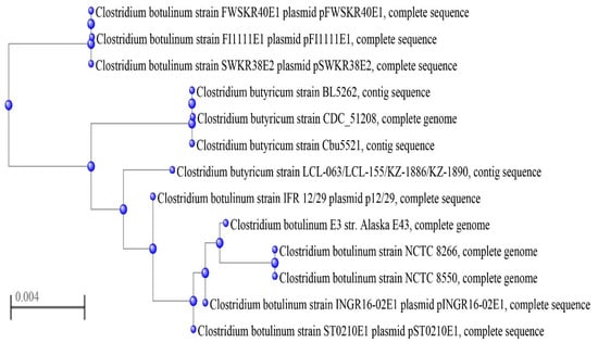 Moreover, the analysis revealed a high coverage (>99%) with 51 sequences, of which 48 were from C. botulinum type E strains and the remaining three were from C. butyricum type E strains (CDC 51208, BL 5256 and Cbu 5521) (Figure S1, Supplementary Materials). The highest identity rate (98.30%) was with the bont/e1 gene sequences of some C. botulinum strains, including those in the plasmids of C. botulinum strains IFR 12/29 and CB 11/1-1. The identity rate with the bont/e4 genes of the C. butyricum strains (CDC 51208, BL 5256 and Cbu 5521) was 97.29%.