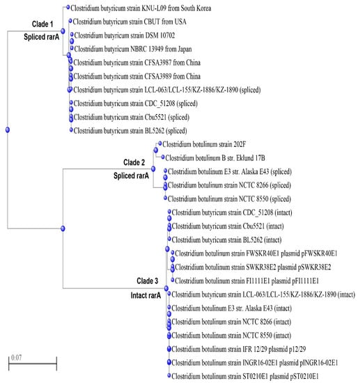 Clade 2 included a class of spliced (reconstructed) rarA genes of the C. botulinum strains Alaska E 43, NCTC 8266 and NCTC 8550, which were similar to the intact rarA genes of C. botulinum type B and F strains Eklund 17 B and 202 F, respectively (Figure 5).