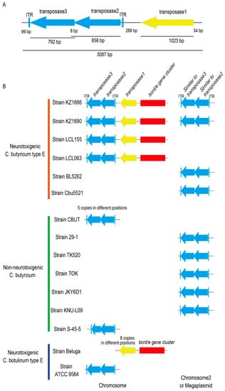 From this perspective, WGS analysis has proved to be a powerful tool for predicting bont gene mobility. Regarding the bont/e gene, the results of a WGS analysis of different BoNT/E-producing strains previously suggested that it might be mobile through transposition, even though TEs close to the bont/e gene were never reported, and/or plasmid conjugation [,].
