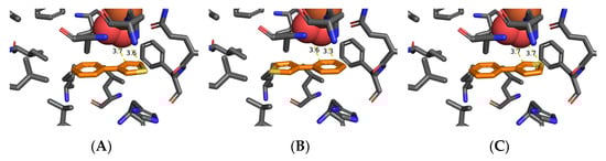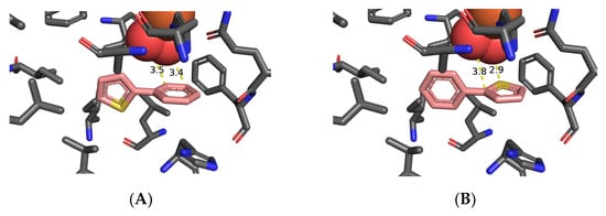 The orientation of substrate 1k (Figure 3B), with a binding energy (−4.5 kcal mol−1), and proximity of the 2,3-bond of the phenyl ring to dioxygen (3.3–3.6 Å), would also lead to cis-dihydroxylation and the (1S,2R) absolute configuration of the isolated dihydrodiol 9k (>98% ee, Table 2) []. The favored orientation of substrate 1k (Figure 3C), with binding energy (−4.7 kcal mol−1), and proximity of the S atom to the nearest dioxygen atom (3.7 Å), would result in sulfoxidation of substrate 1k to yield an excess of one enantiomer of 3-phenylthiophene-1-oxide 5k, prior to its rapid racemization and dimerization to give disulfoxide 6k (Table 2). Earlier GOLD and Autodock Vina molecular docking studies of mono- and poly-cyclic arene and heteroarene substrates within the TDO active site concluded that their preferred orientations were controlled by: (i) attractive edge-to-face (T-bond) interactions between orthogonal phenyl (Phe-216) groups of TDO and phenyl or pyridyl groups of substrates, (ii) van der Waals interactions with proximate hydrophobic amino acids (Ile-276, Leu-272, Ile-324, Val-309, Leu-272, and Phe-352, Figure 1A) [,,,,,,]. Attractive edge-to-face interactions are also found between phenyl rings of TDO (Phe-216) and of substrates 1g (Figure 2A) and 1k (Figure 3B). Edge-to-face interactions, between phenyl and thienyl groups, were earlier identified by NMR and X-ray crystallographic studies of imines []. Similar novel edge-to-face interactions are observed between phenyl (Phe-216) and thienyl rings in substrates 1a (Figure 1A,B), 1g (Figure 2A,B), 1k (Figure 3A–C).