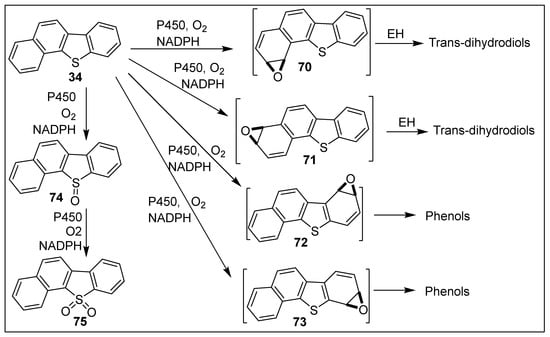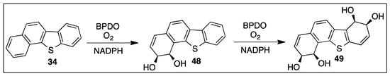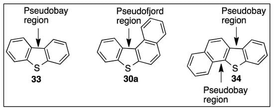 The angular junction, between three fused benzene rings found in phenanthrene or chrysene, is classified as a bay region. A strong preference for BPDO-catalyzed cis-dihydroxylation of bonds, proximate to a bay region, was found for tricyclic arenes, e.g., phenanthrene [,,] and tetracyclic arenes, e.g., benz[a]anthracene or chrysene [,,]. An angular region, between benzene rings fused with a thiophene ring, as in dibenzo[b,d]thiophene 33, or between a fused benzene, thiophene, and naphthalene ring, as in benzo[b]naphtho[2,1-d]thiophene 34, is designated a pseudo-bay region (Figure 4).