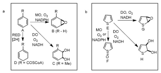Biotransformations of monocyclic thiophene and polycyclic thiophene (thiaarene) substrates were conducted using wild-type, mutant, and recombinant bacterial strains expressing ring-hydroxylating dioxygenases with different active site capacities. The most widely used enzymes were toluene dioxygenase (TDO), naphthalene dioxygenase (NDO), and biphenyl dioxygenase (BPDO). The exact nature of the catalytic cycle involved in ring-hydroxylating dioxygenase-catalyzed cis-dihydroxylations remains unresolved, but possible mechanisms for producing arene metabolites are available [,].