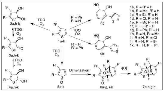 TDO-catalyzed metabolism of thiophenes 1a–k.