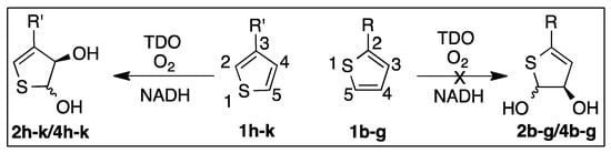 Contrasting TDO-catalyzed dihydroxylations for thiophenes 1h–k and 1b–g.