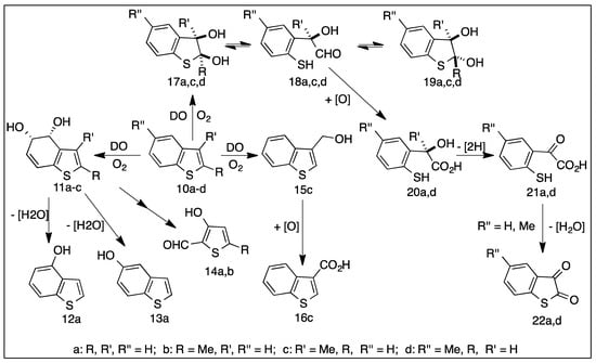 Benzo[b]thiophene 2,3-dione metabolites 22a and 22d from substrates 10a and 10d, were obtained from dihydrodiol intermediates 17a and 17d when using wild-type P. putida strains (Scheme 4) [,,]. The metabolic sequence progressed via further intermediates (18a and 18d), → (20a and 20d) → (21a and 21d) and was also observed in other bacterial strains [].