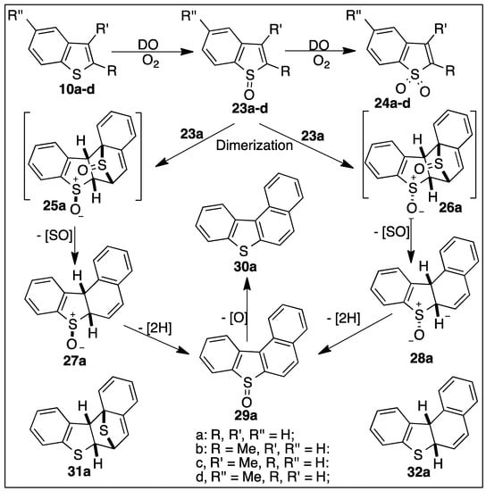 Several mechanisms were proposed for the formation of metabolites 27a–30a (Scheme 5) [,,]. One mechanism involved spontaneous dimerization of monosulfoxide 23a to form transient bis-sulfoxide diastereoisomers 25a and 26a, followed by abiotic rearomatization to yield benzo[b]naphtho[1,2-d]thiophene 30a [].