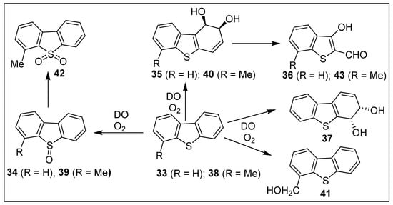 Dibenzo[b,d]thiophene 33, one of the most common polycyclic thiophenes present in crude oil and other fossil fuels, was used as a model substrate for many biodegradation and biodesulfurization studies []. Dioxygenase-catalyzed biotransformations (P. putida, P. jianii, P. alcaligenes, P. stutzeri, Burkholdia, and Sphingomonas strains) of substrate 33 yielded sulfoxide 34. Ring-opened bioproducts like aldehyde 36 were derived from cis-dihydrodiol intermediate 35 (Scheme 6) [,]. NDO-catalyzed sulfoxidation of substrate 33 was also observed using the purified enzyme [].