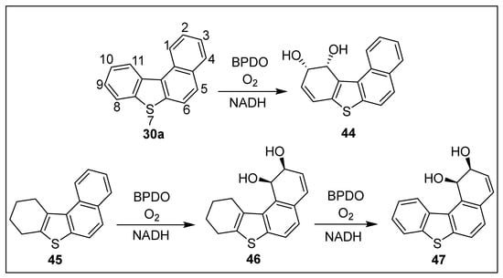 Benzo[b]naphtho[1,2-d]thiophene 30a and the corresponding sulfoxide 29a were isolated as metabolites from the biotransformations (P. putida strains, expressing TDO and NDO, and Sphingomonas XLDN2-5) of benzo[b]thiophene 10a (Scheme 5) [,,,]. No further TDO-catalyzed metabolites of compound 30a were detected due to its relatively large size. The larger active site of the BPDO (S. yanoikuyae B8/36) was able to accommodate and facilitate the metabolism of tetracyclic substrates 30a and 45 (Scheme 7). BPDO-catalyzed cis-dihydroxylation occurred exclusively within the fjord region of benzo[c]phenanthrene []. Under similar conditions, biotransformation of benzo[b]naphtho[1,2-d]thiophene 30a resulted in cis-dihydroxylation within the pseudo- fjord region to give (10S,11R)-dihydrodiol 44 exclusively (>98% ee; Scheme 7) [].