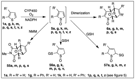 Sulfoxides formed by dioxygenase-catalyzed oxidation of alkylaryl sulfides [,,,] are configurationally stable, i.e., with inversion barriers (ΔG‡) > 23.0 kcal mol−1. Conversely, monocyclic thiophene sulfoxides (e.g., 1a and 1g) were predicted to have much lower barriers (ΔG≠ = 11–14 kcal mol−1), due to aromatic stabilization of their planar transition states [,,]. Monocyclic thiophene sulfoxides, with bulky substituents, are more thermally stable. Thus 2,5-diphenylthiophene-1-oxide is sufficiently stable for X-ray crystallography studies []. Several racemic monocyclic thiophene sulfoxides, with bulky groups, were sufficiently stable to provide experimental confirmation of these relatively low barriers by NMR spectroscopic methods (ΔG≠ = 14.8; 15.9 kcal mol−1) [,]. Thiophene sulfoxide metabolites 5b–g are susceptible to rapid racemization and cycloaddition, thus yielding racemic sulfoxide dimers 6b–g (Scheme 2). Individual sulfoxide enantiomers can have different medical efficacy values, e.g., omeprazole, esomeprazole, modafinil, and armodafinil [], but, with low sulfoxide inversion barriers for drugs containing monocyclic thiophenes, spontaneous racemization will occur.