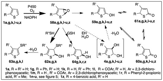 - Dansette, P.M.; Thebault, S.; Durand-Gasselin, L.; Bertho, G.; Mansuy, D. Reactive metabolites of thiophenic compounds: A new trapping method for thiophene sulfoxides. Drug Metab. Rev. 2010, 42, 233–234. [Google Scholar]