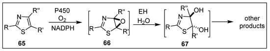 TDO- and NDO-catalyzed stereoselective sulfoxidations of alkylaryl sulfides using wild-type, mutant, recombinant strains and purified dioxygenase enzyme often yielded sulfoxide metabolites with high ee values [,,]. Competition between cis-dihydroxylation and sulfoxidation of alkyl aryl sulfides and formation of cis-dihydrodiol sulfoxides was observed []. Results collected using recombinant strains expressing TDO and NDO provided supporting evidence that dioxygenases were also responsible for thiophene sulfoxidations, with both wild-type and mutant bacterial strains. A contest between sulfoxidation and epoxidation of monocyclic thiophenes and thiophene-containing drugs was also found using cytochrome P450 monooxygenases as biocatalysts (Section 6.2 and Section 6.3) [,,,,,,].