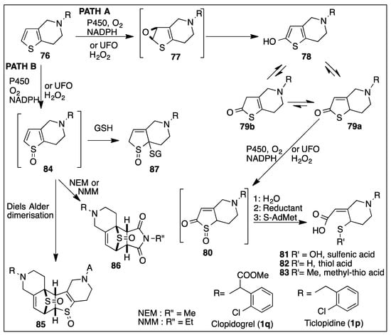 - Dansette, P.M.; Thébault, S.; Bertho, G.; Mansuy, D. Formation and Fate of a Sulfenic Acid Intermediate in the Metabolic Activation of the Antithrombotic Prodrug Prasugrel. Chem. Res. Toxicol. 2010, 23, 1268–1274. [Google Scholar] [CrossRef] [PubMed]