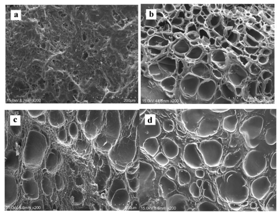 The water absorption capacity of the scaffold is a primary factor in the hydrolysis of the scaffold and for the diffusion of culture medium and nutrients. The swelling curves of SP scaffolds are shown in Figure 9. The swelling properties of bioscaffolds are an important index for evaluating their water absorption capacity. A high-swelling scaffold is a consequence of its porous structure and the number of hydrophilic groups.