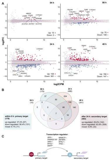 Differential gene expression. Mean-Difference (MA) plots monitor the effects of treatment (10 nM 1,25(OH)2D3) at indicated time points in comparison to solvent (0.1% EtOH) (A). The statistical test for differential expression was conducted as a pairwise comparison for each time point by using EdgeR’s glmTreat method. The difference in expression change (log2FC) for each tested gene was compared with the mean expression level between the compared groups (log2CPM). Significantly (FDR < 0.05) up- and down-regulated genes are highlighted in red and blue, respectively. At each time point the top 10 genes with highest absolute log2FC are labeled. Horizontal lines (red) indicate the applied statistical testing thresholds (absolute FC > 1.5 at 4 and 8 h and absolute FC > 2 at 24 and 48 h). A Venn diagram displays the in total 662 genes identified at different time points (B). Genes responding already at the early time points (4 and 8 h) are considered as primary targets. The direction of regulation of a gene over all time points was determined by applying a FC threshold of 1.5. The classic model of vitamin D signaling suggests that primary target genes encoding for the indicated transcriptional regulators mediate the activation or repression of secondary targets (C). Asterisks (*) denote genes with mixed FC profiles. Arrows indicate transcription start sites.