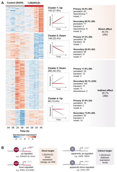 This study describes the temporal changes of the transcriptome of human PBMCs in response to 1,25(OH)2D3 analyzed by classical differential gene expression as well as via clustering analysis. Compared to traditional analysis of a single treatment time, such as 24 h [33,35], the use of multiple time points does not only identify a higher number of vitamin D target genes, but also allows differentiating them either into 179 primary and 483 secondary targets or into 293 direct and 369 indirect targets. Although there is reasonable overlap between primary and direct vitamin D target genes as well as between secondary and indirect targets, the terms represent different mechanistic conceptions of vitamin D signaling. The essential condition of a primary vitamin D target gene is that within the same TAD an enhancer with a VDR binding site is found [34]. In contrast, a secondary vitamin D target gene does not require the presence of a VDR bearing enhancer, but its transcriptional activity is controlled by transcription factors, co-factors or chromatin modifiers that are encoded by primary vitamin D target genes. For comparison, a direct vitamin D target gene is either up- or down-regulated by 1,25(OH)2D3 in relation to a time-matched solvent control, i.e., the VDR ligand affects gene expression over time, while the control sample does not change. The opposite applies for indirect target genes, which are primarily responding to environmental conditions, such as cellular stress due to isolation and ex vivo culture of PBMCs but not to 1,25(OH)2D3. In this context, 1,25(OH)2D3 has a stabilizing effect on the transcriptome, i.e., vitamin D counteracts transcriptional changes triggered by other factors. Thus, more than half of the 662 target genes are responding indirectly to vitamin D treatment.