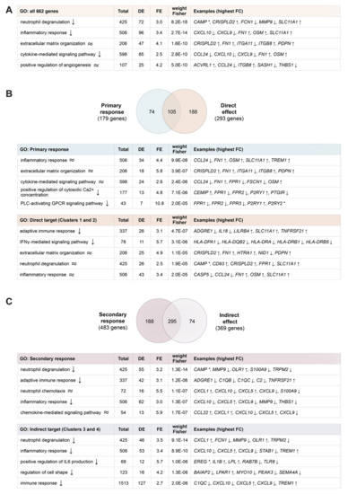 The functional impact of the changes in the expression of the identified 662 vitamin D target genes was analyzed via Gene Ontology (GO) term enrichment (Figure 3A). Accordingly, 1,25(OH)2D3 down-regulates “neutrophil degranulation”, “inflammatory response” as well as “cytokine-mediated signaling pathway” and affects “extracellular matrix organization” as well as “positive regulation of angiogenesis”. The 179 primary vitamin D target genes influence “inflammatory response”, “extracellular matrix organization” as well as “cytokine-mediated signaling pathway” and down-regulate “positive regulation of cytosolic Ca2+ concentration” as well as “PLC (phospholipase C)-activating GPCR (G protein-coupled receptor) signaling pathway” (Figure 3B). Since 105 primary target genes are also direct vitamin D targets, both set of genes modulate “extracellular matrix organization” and “inflammatory response”. In addition, direct vitamin D target genes down-regulate “adaptive immune response” and “IFNγ (interferon gamma)-mediated signaling pathway” and affect “neutrophil degranulation”. The 483 secondary vitamin D target genes down-regulate “neutrophil degranulation”, “adaptive immune response” as well as “inflammatory response” and affect “neutrophil chemotaxis” as well as “chemokine-mediated signaling pathway” (Figure 3C). Of this gene set 295 members are also indirect vitamin D targets and both groups of genes agree on the down-regulation of “neutrophil degranulation” and “inflammatory response”. Furthermore, indirect target genes down-regulate “positive regulation of IL6 (interleukin 6) production”, “regulation of cell shape” and “immune response”. In a more focused approach, the 17 different genes representing the top five genes mediating the top five functions of primary target genes were compared with representative 21 direct target genes (Figure S7, left). The most representative unique function of the primary target genes is “PLC-activating GPCR signaling pathway” and “IFNγ-mediated signaling pathway” for direct target genes, while “inflammatory response” is a common function. In the same way the 16 most representative secondary target genes were compared with 21 indirect target genes (Figure S7, right), which resulted in the pathways “chemokine-mediated signaling pathway” and “positive regulation of IL6 production” representing uniquely secondary targets and indirect targets, respectively, while “neutrophil degranulation” being common for both.