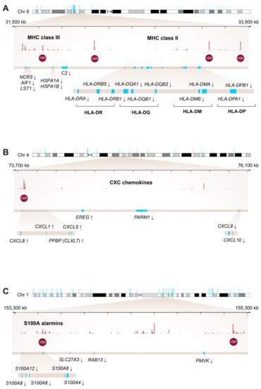 The inspection of the lists of vitamin D target genes representing the major biological processes regulated by 1,25(OH)2D3 in PBMCs (Figure 3 and Figure S7) highlighted a couple of gene families with key impact on the function of the immune system. Importantly, 10 of 12 genes that encode for the α- and β-chains of the major histocompatibility complex (MHC, also named human leukocyte antigen (HLA)) class II proteins, HLA-DRA, HLA-DRB1, HLA-DRB5, HLA-DQA1, HLA-DQB1, HLA-DQB2, HLA-DMA, HLA-DMB, HLA-DPA1 and HLA-DPB1, are persistently down-regulated vitamin D target genes (Figure 4A). Interestingly, with the exception of HLA-DMA and HLA-DMB all are also direct targets. The HLA genes are located in a dense cluster with the down-regulated vitamin D target genes NCR3 (natural cytotoxicity triggering receptor 3), AIF1 (allograft inflammatory factor 1), LST1 (leukocyte specific transcript 1), HSPA1A (heat shock protein family A (Hsp70) member 1A), HSPA1B and C2 (complement C2). Within this genomic region of approximately 2 Mb in chromosome 6, four persistent VDR binding sites are known [25]. Furthermore, from the family of C-X-C motif chemokine ligands (CXCLs) in chromosome 4, a similarly sized genomic region contains the up-regulated vitamin D target genes CXCL1, CXCL5, CXCL7 (official gene name PPBP (pro-platelet basic protein)), CXCL8 and EREG (epiregulin) as well as the down-regulated genes CXCL9, CXCL10 and PARM1 (prostate androgen-regulated mucin-like protein 1) (Figure 4B). In this region there is only one persistent VDR binding site. Moreover, from the S100A (S100 calcium binding protein A) genes of the alarmin family in chromosome 2 S100A4, S100A6, S100A8, S100A9 and S100A12 as well as the genes SLC27A3 (solute carrier family 27 member 3), RAB13 (RAB13, member RAS oncogene family) and PMVK (phosphomevalonate kinase) are down-regulated by 1,25(OH)2D3 (Figure 4C). In this 2 Mb region two persistent VDR binding sites are found.