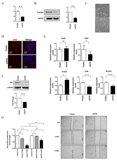 As shown in Figure 1A, the analysis of SYNCRIP levels highlighted that this RBP was upregulated in the transdifferentiation process. In order to evaluate whether SYNCRIP modulation was only correlative or rather causal to the EMT, we analyzed the effects of SYNCRIP knockdown. To achieve this aim, hepatocytes were stably infected with retroviral vectors expressing different shRNAs against SYNCRIP (shSYN) and a scrambled sequence as a control (shCTR). RT-qPCR and Western blot analysis validated that SYNCRIP levels in shSYN cells were significantly reduced by the viral vectors targeting its transcript (Figure 1B,C; in line with [33]).