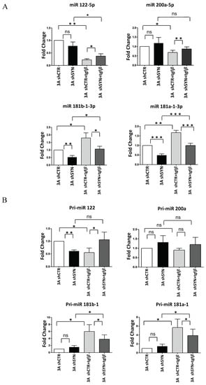 SYNCRIP controls anti and pro-EMT miRNA levels in hepatocytes undergoing TGFβ-induced EMT. (A) qRT-PCR analysis of intracellular levels of anti-EMT microRNAs (miR-122-5p and miR-200a-5p) and pro-EMT microRNAs (miR-181a1-3p and miR-181b1-3p) in 3A shCTR and 3AshSYN cells treated or not with TGFβ. The values are calculated via the 2 (−Ct) method, normalized to the cel-miR-39, expressed as fold enrichment, and shown as mean SD. Statistically significant differences are reported for six independent experiments (* p < 0.05; ** p < 0.01; *** p < 0.001; ns = no significance). (B) qRT-PCR analysis of intracellular levels of the indicated pri-miRNAs in the same cells as in (A). The values are calculated via the 2 (−Ct) method, normalized to the 18S ribosomal RNA levels, and shown as mean SD. Statistically significant differences are reported for four independent experiments (* p < 0.05; ** p < 0.01; ns = no significance).