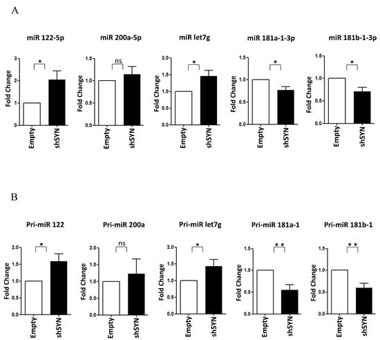 SYNCRIP controls anti and pro-EMT miRNA levels in hepatoma cells. (A) qRT-PCR analysis of intracellular levels of anti-EMT microRNAs (miR-122-5p, miR-200a-5p, and let7-g-5p) and pro-EMT microRNAs (miR-181a1-3p and miR-181b1-3p) in BW1J shSYN compared to control cells (empty). The values are calculated via the 2 (−Ct) method, normalized to the cel-miR-39, expressed as fold enrichment, and shown as mean SD. Statistically significant differences are reported for four independent experiments (* p < 0.05; ns = no significance). (B) qRT-PCR analysis of intracellular levels of the indicated pri-miRNAs in the same cells as in (A). The values are calculated via the 2 (−Ct) method, normalized to the 18S ribosomal RNA levels, and shown as mean SD. Statistically significant differences are reported for seven independent experiments (* p < 0.05; ** p < 0.01; ns = no significance).