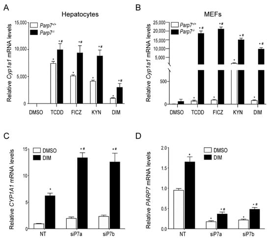 PARP7 represses CYP1A1 expression in MEFs, hepatocytes and Caco-2 cells. AHR ligand induced Cyp1a1 levels are higher in (A) hepatocytes and (B) MEFs isolated from Parp7−/− compared to Parp7+/+ mice. Hepatocytes and MEFs were isolated from livers of Parp7−/− and Parp7+/+ mice and treated with DMSO, 10 nM TCDD, 10 nM FICZ, 200 μM KYN or 10 μM DIM for 6 h. The Cyp1a1 mRNA levels were determined with RT-qPCR. * p < 0.05 two-way ANOVA compared with genotyped-matched control treated hepatocytes or MEFs. # p < 0.05 two-way ANOVA compared with ligand matched Parp7+/+ hepatocytes or MEFs. (C,D) RNAi-mediated knockdown of PARP7 increased DIM-induced CYP1A1 levels. Caco2 cells were transfected with two different siRNAs targeting PARP7 and treated with DMSO and 10 μM DIM for 6 h. Relative CYP1A1 mRNA and PARP7 mRNA levels were determined with RT-qPCR. * p < 0.05 two-way ANOVA compared with control treated non-targeted (NT) Caco-2 cells. # p < 0.05 two-way ANOVA compared with DIM-treated NT Caco-2 cells.