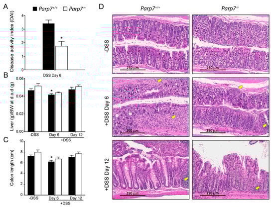 DSS administered in the drinking water disrupts the intestinal lining primarily at the site of the colon. This can lead to symptoms in mice, such as rectal prolapse, rectal bleeding, diarrhea, and hematochezia. Together, these are combined and scored as a disease activity index (DAI), which is an indication of severity of the colitis []. Parp7+/+ mice displayed a significantly greater DAI than Parp7−/− mice on day 6 of DSS treatment, suggesting that Parp7−/− mice were less susceptible to DSS-induced pathological changes in the colon (Figure 3A). Both body weight-adjusted liver weight and colon length were more reduced in Parp7+/+ than in Parp7−/− mice on day 6 (Figure 3B,C). However, no differences were observed by day 12. Histological analysis of colon sections from day 6 and day 12 DSS-treated Parp7+/+ mice displayed prototypical features of DSS-induced colitis, including regions of major crypt loss and mucosal inflammation with neutrophilic infiltration (Figure 3D). In contrast, Parp7−/− mice displayed less crypt damage and inflammatory infiltration in mucosal regions at day 6. Vehicle-treated mice from both genotypes displayed normal colon mucosal morphology. Although the mice recovered in terms of body weight by day 12 (six days after removal of DSS from drinking water), there was still evidence of inflammatory infiltration within the mucosal regions of both genotypes. Crypt regeneration was particularly evident in Parp7+/+ mice, which also displayed greater crypt loss at day 6.