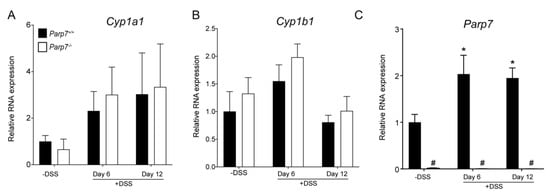Parp7, but not Cyp1a1 and Cyp1b1 expression levels are increased in response to DSS. The expression levels of (A) Cyp1a1 and (B) Cyp1b1 in colonic tissue are unaffected by genotype or exposure to 2% DSS in drinking water. (C) Parp7 expression is induced in colon tissue isolated from DSS treated Parp7+/+ mice. * p < 0.05 two-way ANOVA compared with genotyped-matched and DSS treated animals. # p < 0.05 two-way ANOVA compared with time matched Parp7+/+ mice.