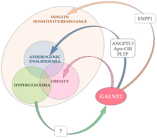 Taken altogether, the data that we have reported here are quite consistent with the contribution of GALNT2 to several highly prevalent metabolic abnormalities sharing the common ground of insulin resistance, namely atherogenic dyslipidemia, type 2 diabetes and obesity. Unfortunately, they leave open the question on which mechanisms underlie some of the effects of GALNT2 on the aforementioned diseases. Pathways through which GALNT2 impairs lipid metabolism and insulin resistance have been partly identified, while those connecting GALNT2 to hyperglycemia/type 2 diabetes and obesity are only scarcely understood. With this caveat in mind, it is possible to envision a scenario in which GALNT2 operates through various mechanisms (Figure 1). The simplest, and probably too simple, picture is with GALNT2 changes inducing insulin resistance, which is pathogenic for virtually all the metabolic disorders mentioned above. Conversely, in a more complex and probably more realistic scenario, alternative pathogenic pathways, uniquely affecting different metabolic abnormalities, can be envisioned. This second hypothesis is facilitated by the knowledge that different degrees of GALNT2 changes affect differently specific protein functions in an organ-specific manner, thus causing clinically distinct phenotypes (pleiotropism) [88]. A clear paradigm of this pleiotropic effect comes from data showing that while mild changes in ppGalNAc-T2 activity have been associated only with dyslipidemia [9,10,13,14], very rare and severe LOF homozygous mutations, other than heavily impairing lipid metabolism [9,86,92], cause the multisystem GALNT2-congenital disorder of glycosylation (CDG2T), which severely affects the central nervous system, muscle function, immunity control, several aspects of the endocrine system, and coagulation [18,86].