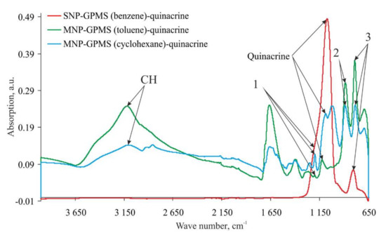 All three samples show a strong band corresponding to the wavenumber 1130 cm−1. This band is not present in the reference spectrum of the GPMS-modified magnetic nanoparticles. Therefore, it can be attributed to the immobilized quinacrine. Since quinacrine was covalently immobilized, a 1230 cm−1 shift of the reference band was possible, which was observed in the samples based on magnetic and silica nanoparticles.
