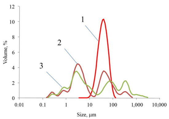 Particle size distribution upon chitosan condensation from acid solutions: (1) acetic acid; (2) oxalic acid; (3) citric acid.