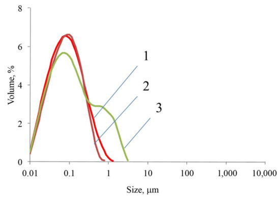 Particle size distribution upon chitosan condensation on SNPs from acid solutions: (1) acetic acid; (2) oxalic acid; (3) citric acid.
