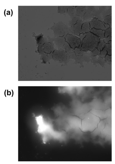 The use of a fluorescence microscope (Figure 9) made it possible to prove the presence of quinacrine in the nanocomplex under a layer of chitosan and indocyanine green. The image, isolated using light filters for the quinacrine emission wavelength, demonstrates clear fluorescence upon excitation with ultraviolet light (Figure 9b) as compared with the light channel (without light filters) (Figure 9a).