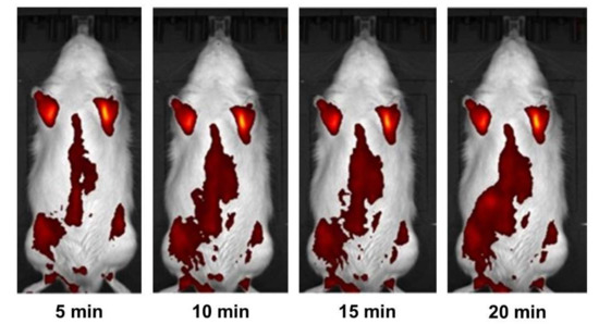 The study of in vivo samples by fluorescence tomography with a secondary shell of indocyanine green was carried out on male SPF Wistar rats that were previously anesthetized with isoflurane by intravenous administration of 2 mL of the drug with a concentration of 2 mg/mL. The result is shown in Figure 11. The distribution of the drug was observed for 20 min. The figure shows that the drug spread throughout the animal’s body and had begun to be metabolized in the liver by 20 min.