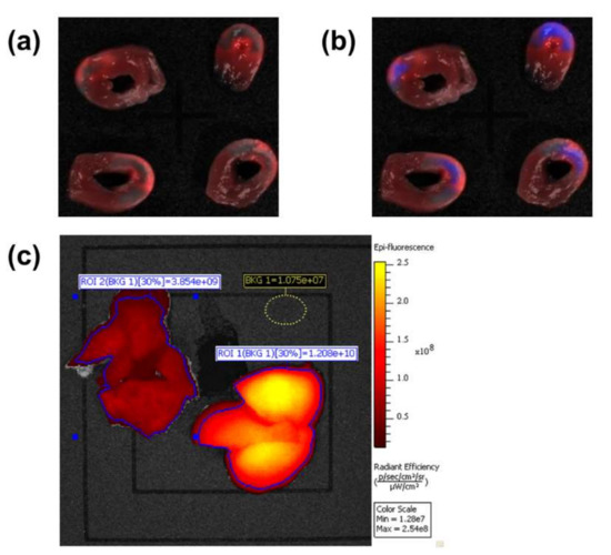 As can be seen from Figure 12, the multilayer nanostructure accumulated in the area of the heart injury, as evidenced by the ICG fluorescence (Figure 12a). Predictably, this fluorescence does not appear in the area of non-restored blood flow. At the same time, there is a fluorescence cutoff by the GFP filter (Figure 12b), which possibly corresponds to porphyrin autofluorescence.