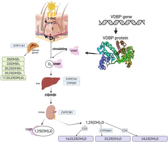 The purpose of the study is to investigate and systematize the current knowledge regarding the impact of VDBP polymorphisms on the risk of incidence of various diseases and human health. The “Vitamin D” (calciferol) term refers to two secosteroids: vitamin D2 (ergocalciferol) and vitamin D3 (cholecalciferol). They are both produced from sterol precursors with light in the UVB spectrum of 280 to 320 nm. In fungi and plants, ergosterol is the vitamins’ D2 precursor, while the vitamins’ D3 precursor is 7-dehydrocholesterol (7-DHC), and its high concentration was found in the skin []. Vitamin D2 and D3 differ in side chains, but both are converted to 25-hydroxyvitamin D 25(OH)D and 1,25-dihydroxyvitamin D [,]. 25OHD is considered to be the best reflection of the vitamin D level in serum []. Vitamin D3 can be synthesized endogenously under ultraviolet (UV) light [].