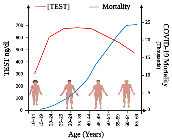 The former fact has been noticed frequently since men with coronavirus infections have shown a lower survival rate than women. In the SARS-CoV epidemics of 2003 and the Middle East respiratory syndrome epidemics of 2012, men had substantially higher fatality rates than women, as in the current COVID-19 pandemic [8]. This gender-related difference in COVID-19 infection susceptibility, severity, and mortality has not been thoroughly explained, although it has been proposed, it might be attributed to genetic, immunological, and hormonal differences. Among these possibilities, the latter seems adequate to explain at least partially the gender-related observations. Furthermore, since the hormone steroid, testosterone (TEST) plasmatic concentrations decrease with aging and the presence of comorbidities (obesity, diabetes mellitus, and cardiovascular diseases) increases during the same period, both circumstances might worsen SARS-CoV-2 patients’ prognosis (Figure 1) [9,10,11,12]. Understandably, multiple studies have been carried out trying to predict the outcome of the disease in patients. In SARS-CoV-2 infected men, TEST has been reported to exert immunosuppressive effects [13] and modulate inflammation [14], which may contribute to attenuated antibody response and worsen the prognosis in comparison to women [14]. SARS-CoV-2 viral entry to host cells has been reported to be through the interaction of the viral spike protein (S) and the Angiotensin-Converting Enzyme 2 (ACE2) receptor, facilitated by the Type II Transmembrane Serine Protease (TMPRSS2) priming the S protein [15,16]. Male sex hormones are also believed to increase the expression of the ACE2 receptor, favoring the SARS-CoV-2 viral infectivity [15]. Furthermore, androgens, including TEST, are the only known promoters of the expression of TPMRSS2 through the activation of the androgen receptor (AR) [17,18]. Not only might TEST participate in the physiopathology of SARS-CoV-2, but the virus can interfere in the hormone’s production [19,20,21,22]. However, when comparing young adult men with elderly patients, when TEST concentrations are progressively decreasing, we observe a greater severity and mortality; therefore, the above mentioned TEST immunosuppressive effects in COVID-19 patients might not be justified.
