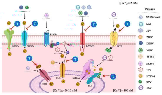 Viruses are intracellular invasive particles that exploit the host cell’s machinery to propagate the viral lifecycle; particularly the intracellular Ca2+ signaling system is hijacked during viral entry, viral gene replication, virion maturation, and release of various viral species [23,41]. Dysfunctions in the host cell’s Ca2+ apparatus have been reported during a viral infection, leading to abnormal [Ca2+]i [23].