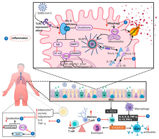 Old age is also accompanied by vitamin D deficiency associated with several chronic degenerative diseases. The non-classical activities of this vitamin are related to immunoregulatory effects. In conjunction with its vitamin D receptor (VDR), it increases macrophages´ autophagic activity and the generation of antimicrobial products and favors a decrease in the expression of pro-inflammatory cytokine genes. These genes are silenced by higher glutathione levels, lowering ROS and suppressing the expression of NF-κB and p38 MAP kinase. Conceivably, elderly patients faced with SARS-CoV-2 infection would be unable to efficiently modulate the inflammatory response, most probably presenting an exacerbated response and severe tissue damage (Figure 3) [171].