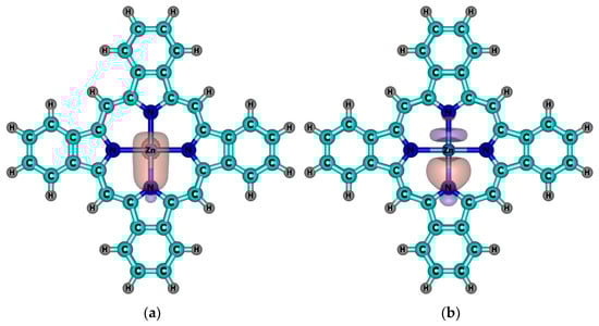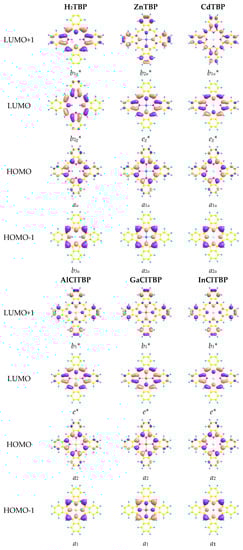 The calculated spectra of the investigated compounds were quite similar, which demonstrates the insignificant influence of the metal nature to the position of the Q-band. In the spectrum of H2TBP, the splitting of the Q-band into two bands was observed. Q-band splitting occurred because of the double-degenerated LUMOs of eg* symmetry of MTBP, which split into two b1g* and b2g* orbitals of H2TBP, since the latter had a lower symmetry compared with the metal complexes. A negligible batochromic shift for the complexes with axial ligands, and a hypsochromic shift for Cd and Zn occurred with a metal being introduced into the H2TBP molecule (Figure 4).